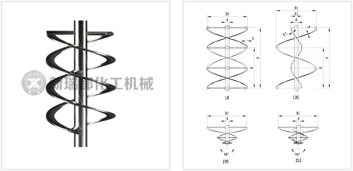 此類攪拌器為慢速型攪拌器,常在層流區操作,液體沿著螺旋面上升或下降形成軸向上下循環,適用于中高粘度液體的混合和傳熱等過程。常用介質粘度μ<10萬cp,常用轉速n=0.5-50rpm,v=2m/s。LD螺帶式攪拌器的螺帶外廊接近于攪拌罐內壁攪拌直徑大,強化了近罐壁的液體的上下循環,高粘度液體的傳熱過程很適用。螺帶螺桿組合式,同時具有螺桿和螺帶的特性,強化了液體內外圍的循環,特別對牛頓型似塑性及彈性液體有效。ZLD錐底螺帶型,ZLG錐底螺帶,其特點是錐形可和錐形釜底相配,可按要求設計。